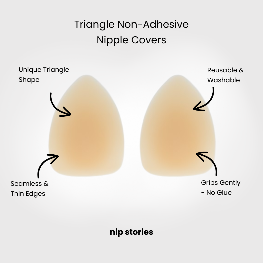our triangle non-adhesive nippys are designed for tricky necklines and sensitive skin. no glue just a natural fit that stays in place with the help of your clothing & body heat. they’re soft, flexible, and totally seamless under any fabric.